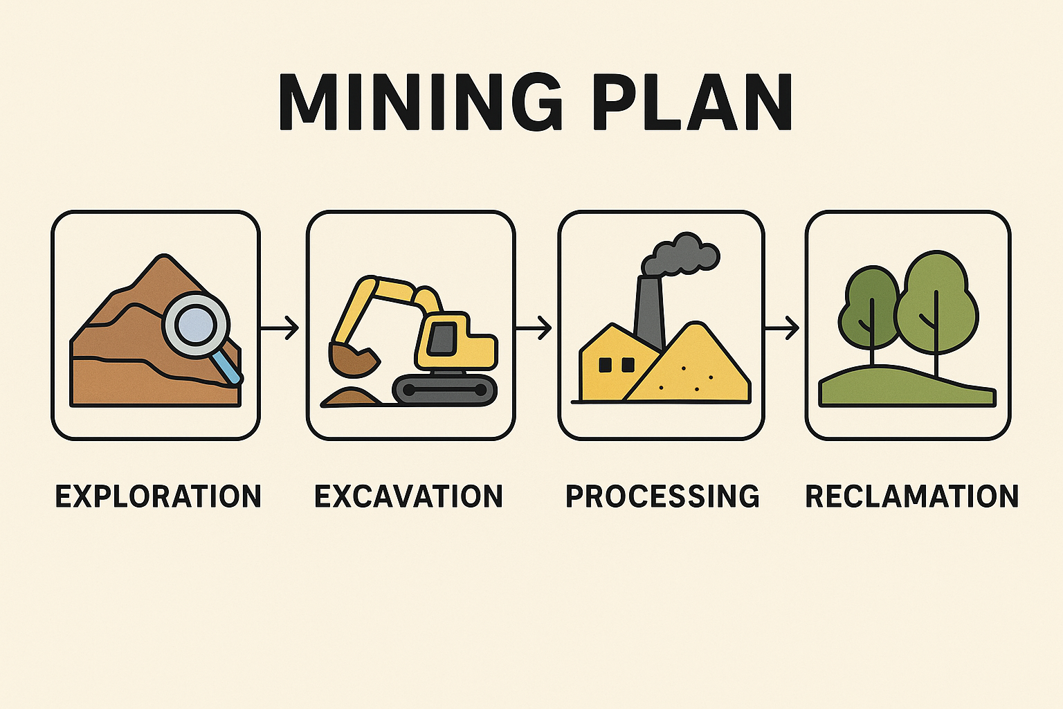 Mining Plan is a detailed document prepared to outline the systematic development and scientific exploitation of a mineral deposit. It includes geological studies, reserve estimation, method of mining, machinery deployment, drilling and blasting techniques, production scheduling, safety measures, environmental management, reclamation, and closure plans. Approved by regulatory authorities (such as IBM in India), the mining plan ensures resource conservation, operational efficiency, worker safety, and environmental sustainability throughout the mine’s lifecycle.
